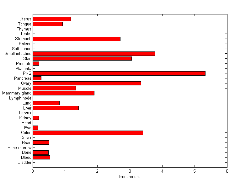 The expression level is normalized with tissue-library size. Each value for a gene in a tissue is a ratio of observed ESTs to the expected one in this tissue. The expected number of ESTs is the product of total ESTs of the gene and the fraction of total ESTs in the tissue among all ESTs in 30 tissues.