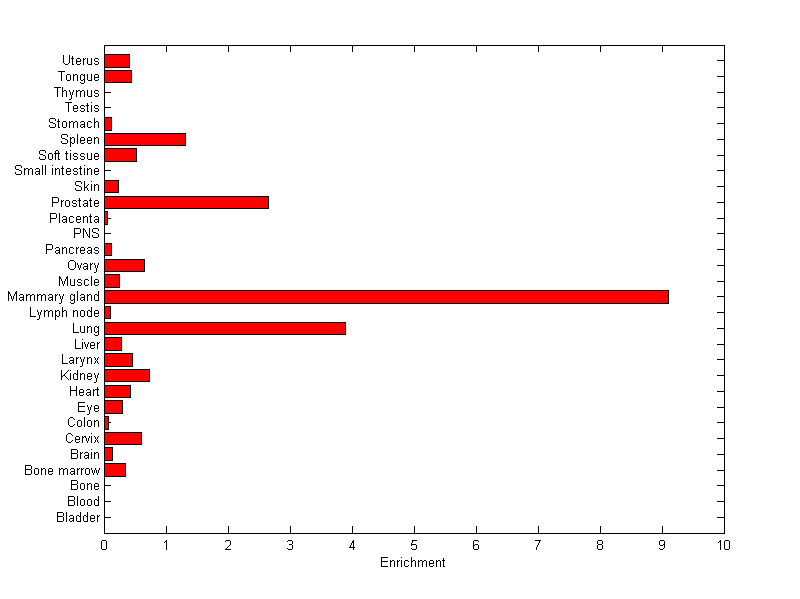 The expression level is normalized with tissue-library size. Each value for a gene in a tissue is a ratio of observed ESTs to the expected one in this tissue. The expected number of ESTs is the product of total ESTs of the gene and the fraction of total ESTs in the tissue among all ESTs in 30 tissues.