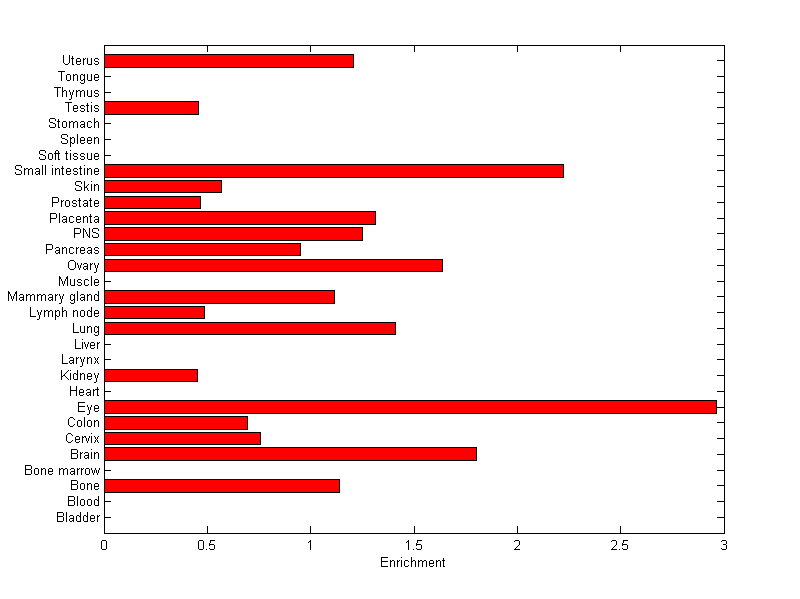 The expression level is normalized with tissue-library size. Each value for a gene in a tissue is a ratio of observed ESTs to the expected one in this tissue. The expected number of ESTs is the product of total ESTs of the gene and the fraction of total ESTs in the tissue among all ESTs in 30 tissues.