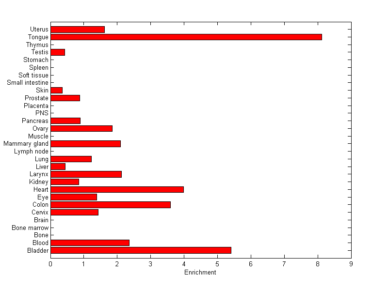 The expression level is normalized with tissue-library size. Each value for a gene in a tissue is a ratio of observed ESTs to the expected one in this tissue. The expected number of ESTs is the product of total ESTs of the gene and the fraction of total ESTs in the tissue among all ESTs in 30 tissues.