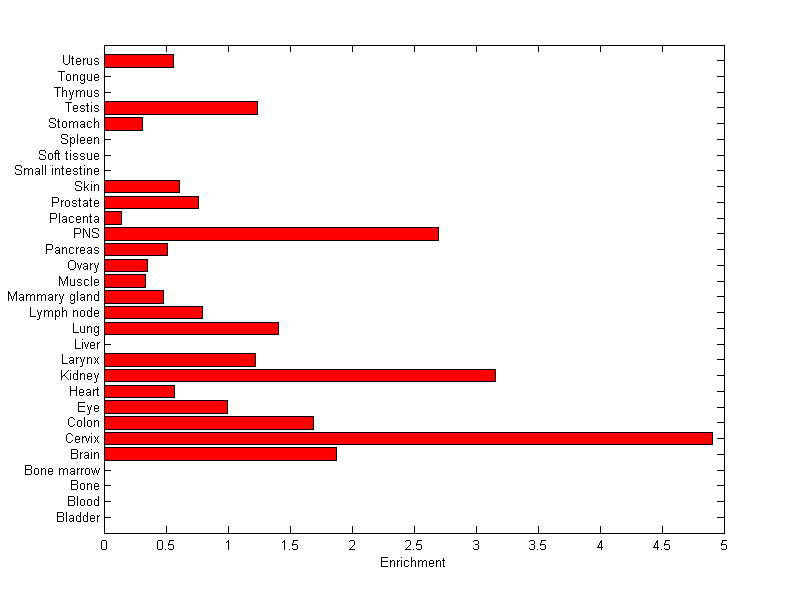 The expression level is normalized with tissue-library size. Each value for a gene in a tissue is a ratio of observed ESTs to the expected one in this tissue. The expected number of ESTs is the product of total ESTs of the gene and the fraction of total ESTs in the tissue among all ESTs in 30 tissues.