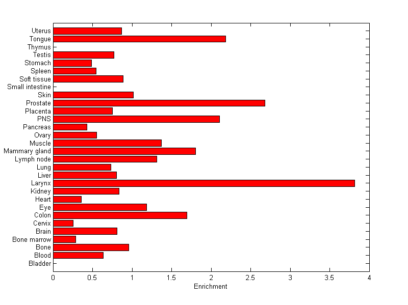 The expression level is normalized with tissue-library size. Each value for a gene in a tissue is a ratio of observed ESTs to the expected one in this tissue. The expected number of ESTs is the product of total ESTs of the gene and the fraction of total ESTs in the tissue among all ESTs in 30 tissues.