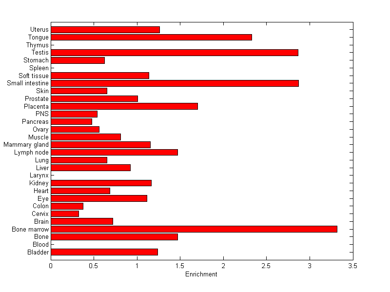 The expression level is normalized with tissue-library size. Each value for a gene in a tissue is a ratio of observed ESTs to the expected one in this tissue. The expected number of ESTs is the product of total ESTs of the gene and the fraction of total ESTs in the tissue among all ESTs in 30 tissues.