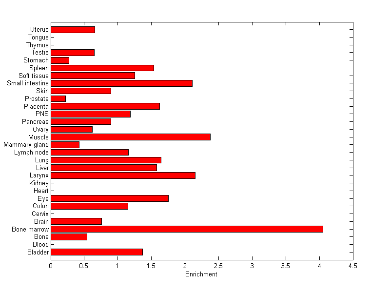 The expression level is normalized with tissue-library size. Each value for a gene in a tissue is a ratio of observed ESTs to the expected one in this tissue. The expected number of ESTs is the product of total ESTs of the gene and the fraction of total ESTs in the tissue among all ESTs in 30 tissues.