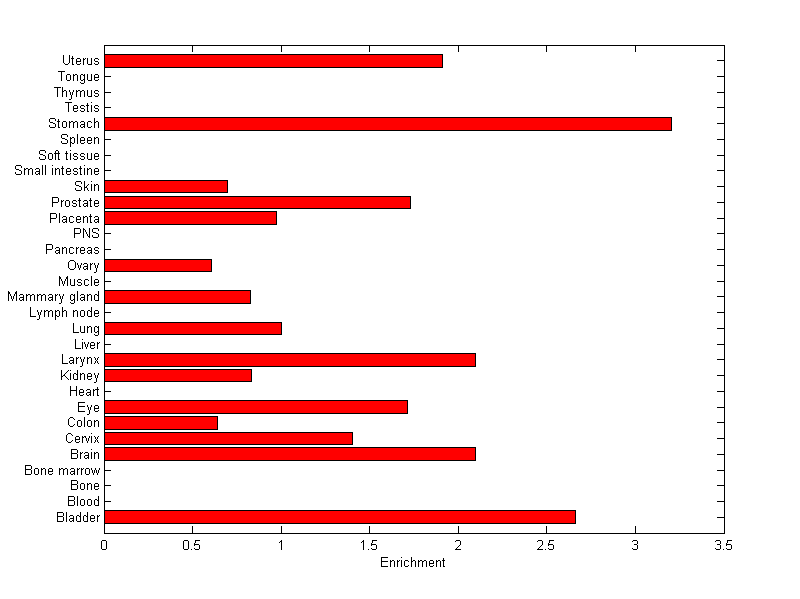 The expression level is normalized with tissue-library size. Each value for a gene in a tissue is a ratio of observed ESTs to the expected one in this tissue. The expected number of ESTs is the product of total ESTs of the gene and the fraction of total ESTs in the tissue among all ESTs in 30 tissues.