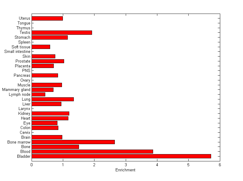 The expression level is normalized with tissue-library size. Each value for a gene in a tissue is a ratio of observed ESTs to the expected one in this tissue. The expected number of ESTs is the product of total ESTs of the gene and the fraction of total ESTs in the tissue among all ESTs in 30 tissues.