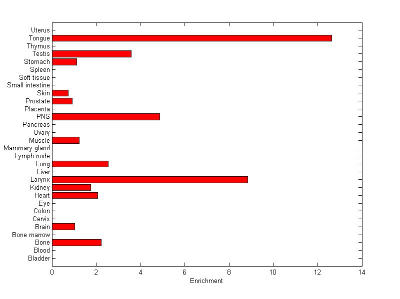 The expression level is normalized with tissue-library size. Each value for a gene in a tissue is a ratio of observed ESTs to the expected one in this tissue. The expected number of ESTs is the product of total ESTs of the gene and the fraction of total ESTs in the tissue among all ESTs in 30 tissues.