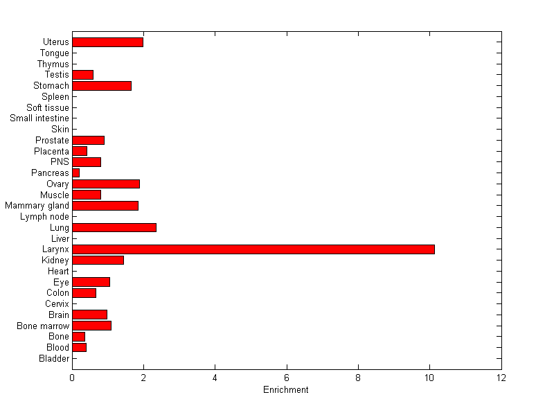 The expression level is normalized with tissue-library size. Each value for a gene in a tissue is a ratio of observed ESTs to the expected one in this tissue. The expected number of ESTs is the product of total ESTs of the gene and the fraction of total ESTs in the tissue among all ESTs in 30 tissues.