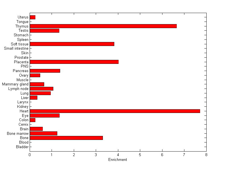 The expression level is normalized with tissue-library size. Each value for a gene in a tissue is a ratio of observed ESTs to the expected one in this tissue. The expected number of ESTs is the product of total ESTs of the gene and the fraction of total ESTs in the tissue among all ESTs in 30 tissues.