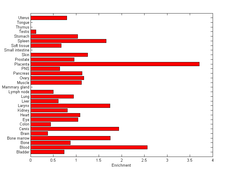 The expression level is normalized with tissue-library size. Each value for a gene in a tissue is a ratio of observed ESTs to the expected one in this tissue. The expected number of ESTs is the product of total ESTs of the gene and the fraction of total ESTs in the tissue among all ESTs in 30 tissues.