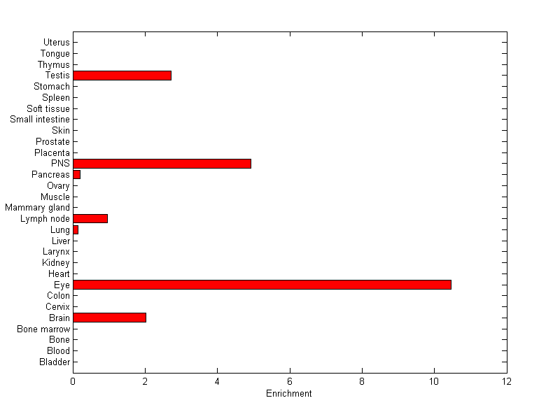 About the profile: The expression level is normalized with tissue-library size. Each value for a gene in a tissue is a ratio of observed ESTs to the expected one in this tissue. The expected number of ESTs is the product of total ESTs of the gene and the fraction of total ESTs in the tissue among all ESTs in 30 tissues. Summary: This gene is preferentially expressed in [eye] Download: |