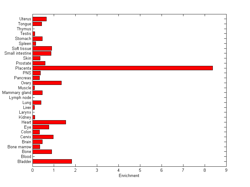 About the profile: The expression level is normalized with tissue-library size. Each value for a gene in a tissue is a ratio of observed ESTs to the expected one in this tissue. The expected number of ESTs is the product of total ESTs of the gene and the fraction of total ESTs in the tissue among all ESTs in 30 tissues. Summary: This gene is preferentially expressed in [placenta] Download: |