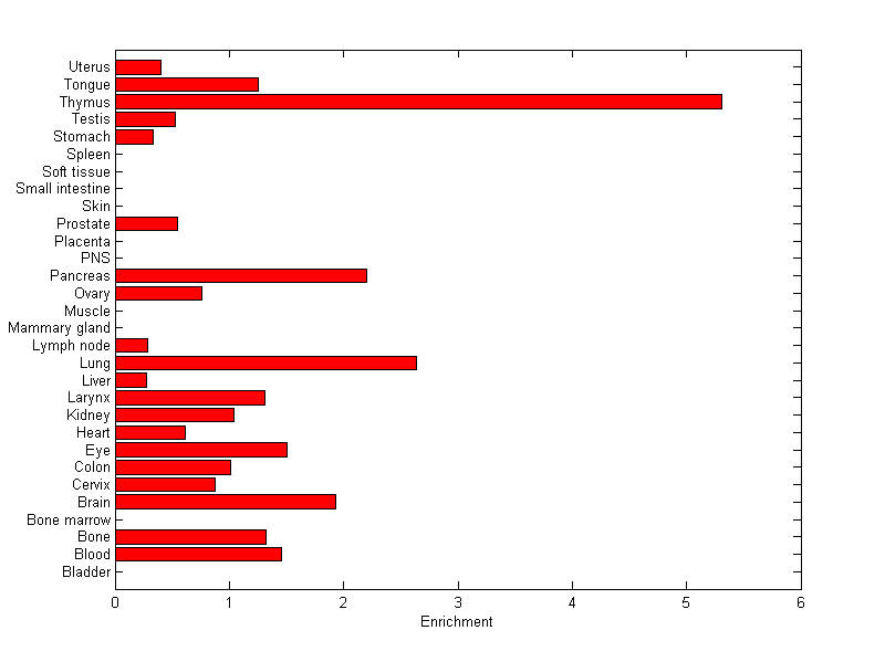 The expression level is normalized with tissue-library size. Each value for a gene in a tissue is a ratio of observed ESTs to the expected one in this tissue. The expected number of ESTs is the product of total ESTs of the gene and the fraction of total ESTs in the tissue among all ESTs in 30 tissues.