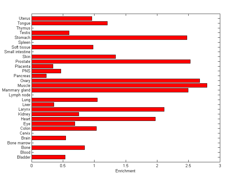 The expression level is normalized with tissue-library size. Each value for a gene in a tissue is a ratio of observed ESTs to the expected one in this tissue. The expected number of ESTs is the product of total ESTs of the gene and the fraction of total ESTs in the tissue among all ESTs in 30 tissues.