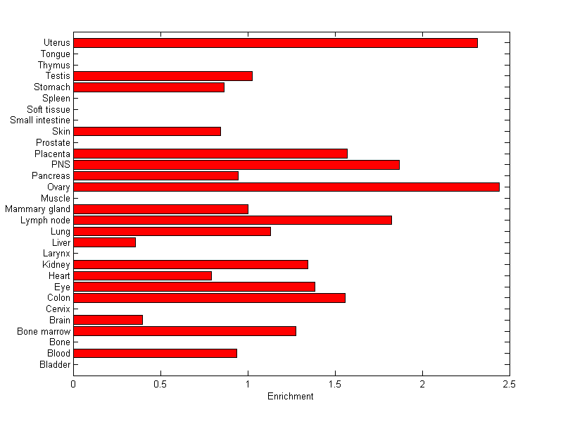 The expression level is normalized with tissue-library size. Each value for a gene in a tissue is a ratio of observed ESTs to the expected one in this tissue. The expected number of ESTs is the product of total ESTs of the gene and the fraction of total ESTs in the tissue among all ESTs in 30 tissues.