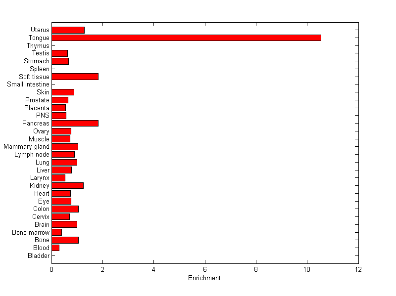 The expression level is normalized with tissue-library size. Each value for a gene in a tissue is a ratio of observed ESTs to the expected one in this tissue. The expected number of ESTs is the product of total ESTs of the gene and the fraction of total ESTs in the tissue among all ESTs in 30 tissues.