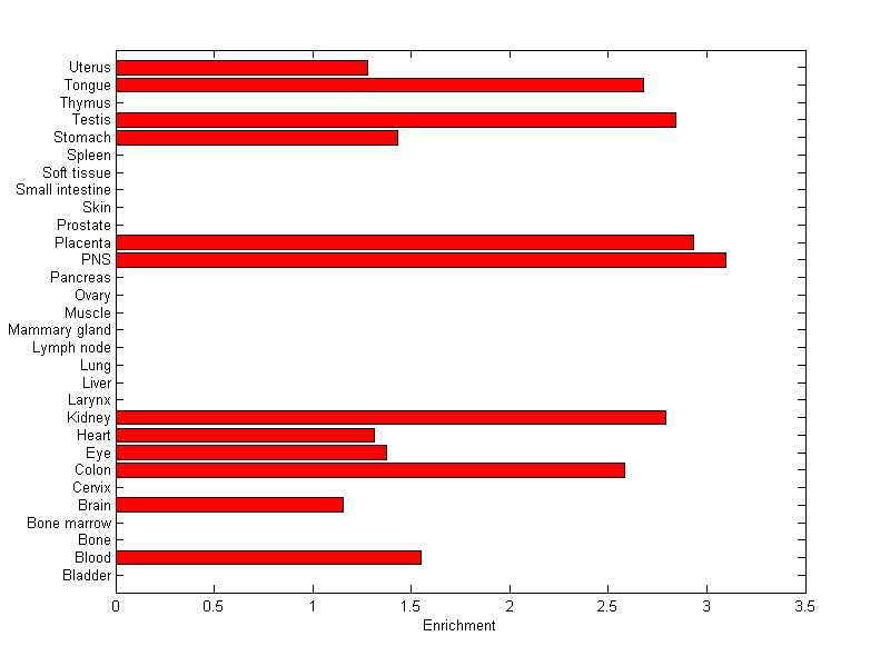 The expression level is normalized with tissue-library size. Each value for a gene in a tissue is a ratio of observed ESTs to the expected one in this tissue. The expected number of ESTs is the product of total ESTs of the gene and the fraction of total ESTs in the tissue among all ESTs in 30 tissues.