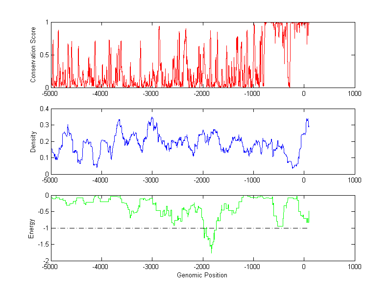 About the profiles: The conservation profile (red curve) is about conservation scores of the promoter sequences. Conservation was determined from an eight-way alignment of human, chimpanzee, dog, mouse, rat, chicken, zebrafish and fugu sequences. The conservation was quantified by a conservation score between 0 and 1, with 1 as highest conservation. The conservation score was obtained from UCSC genome databases. The density profile (blue curve) is about density of all TF binding sites. The energy profile (green curve) is about energy for module detection based on TF interaction. The positions with energy less than -1 indicate the existence of CRMs. Download: Conservation profileDensity profile Energy profile CRM summary |