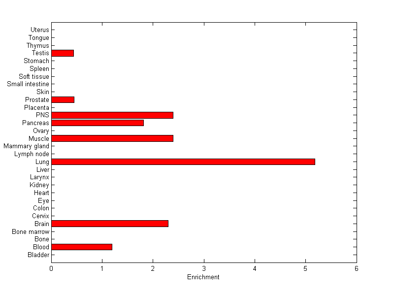 About the profile: The expression level is normalized with tissue-library size. Each value for a gene in a tissue is a ratio of observed ESTs to the expected one in this tissue. The expected number of ESTs is the product of total ESTs of the gene and the fraction of total ESTs in the tissue among all ESTs in 30 tissues. Summary: This gene is preferentially expressed in [lung] Download: |