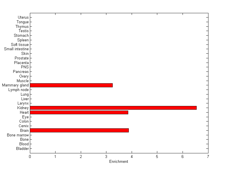 The expression level is normalized with tissue-library size. Each value for a gene in a tissue is a ratio of observed ESTs to the expected one in this tissue. The expected number of ESTs is the product of total ESTs of the gene and the fraction of total ESTs in the tissue among all ESTs in 30 tissues.