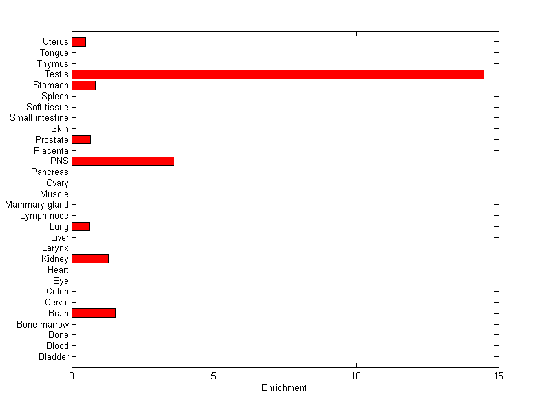 The expression level is normalized with tissue-library size. Each value for a gene in a tissue is a ratio of observed ESTs to the expected one in this tissue. The expected number of ESTs is the product of total ESTs of the gene and the fraction of total ESTs in the tissue among all ESTs in 30 tissues.