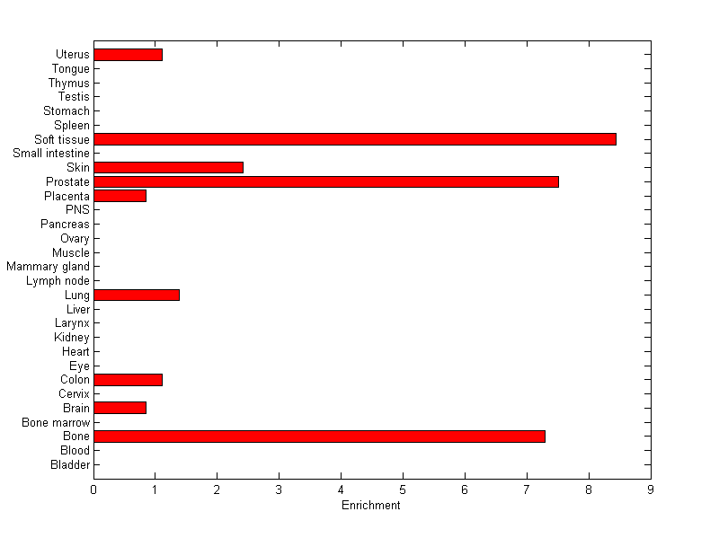 About the profile: The expression level is normalized with tissue-library size. Each value for a gene in a tissue is a ratio of observed ESTs to the expected one in this tissue. The expected number of ESTs is the product of total ESTs of the gene and the fraction of total ESTs in the tissue among all ESTs in 30 tissues. Download: |