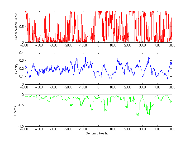 The energy profile (green curve) is about energy for module detection based on TF interaction. The positions with energy less than -1 indicate the existence of CRMs.