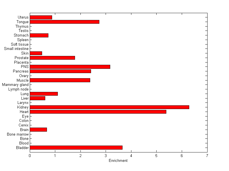 The expression level is normalized with tissue-library size. Each value for a gene in a tissue is a ratio of observed ESTs to the expected one in this tissue. The expected number of ESTs is the product of total ESTs of the gene and the fraction of total ESTs in the tissue among all ESTs in 30 tissues.