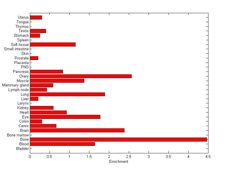 The expression level is normalized with tissue-library size. Each value for a gene in a tissue is a ratio of observed ESTs to the expected one in this tissue. The expected number of ESTs is the product of total ESTs of the gene and the fraction of total ESTs in the tissue among all ESTs in 30 tissues.