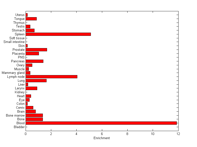The expression level is normalized with tissue-library size. Each value for a gene in a tissue is a ratio of observed ESTs to the expected one in this tissue. The expected number of ESTs is the product of total ESTs of the gene and the fraction of total ESTs in the tissue among all ESTs in 30 tissues.