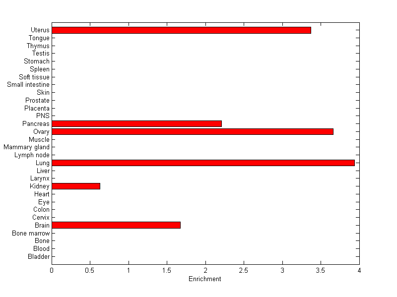 The expression level is normalized with tissue-library size. Each value for a gene in a tissue is a ratio of observed ESTs to the expected one in this tissue. The expected number of ESTs is the product of total ESTs of the gene and the fraction of total ESTs in the tissue among all ESTs in 30 tissues.