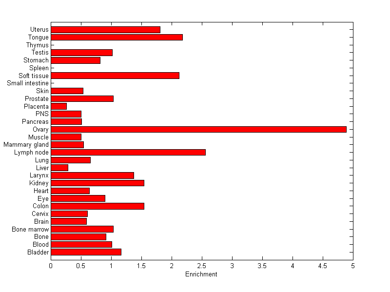 The expression level is normalized with tissue-library size. Each value for a gene in a tissue is a ratio of observed ESTs to the expected one in this tissue. The expected number of ESTs is the product of total ESTs of the gene and the fraction of total ESTs in the tissue among all ESTs in 30 tissues.