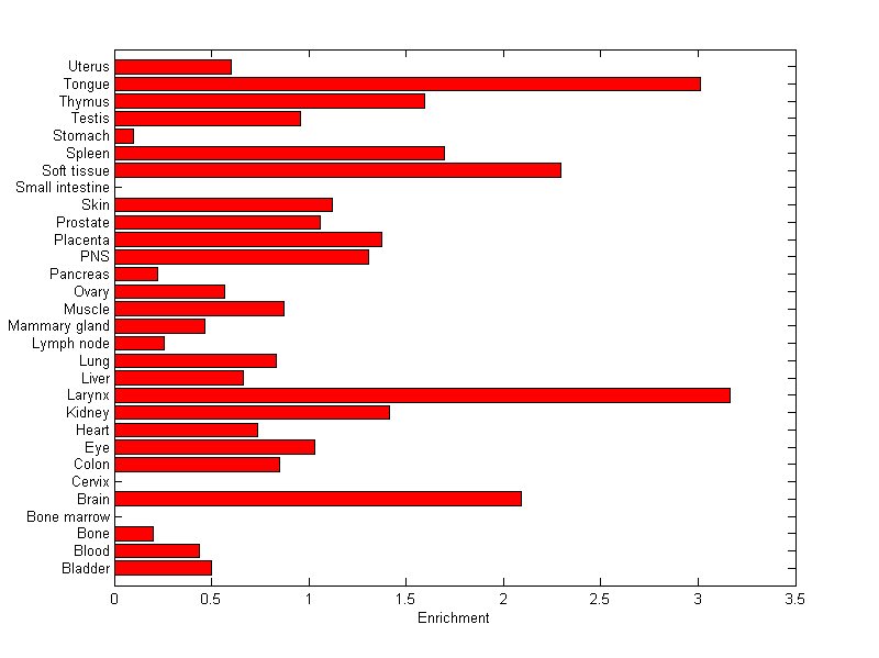 The expression level is normalized with tissue-library size. Each value for a gene in a tissue is a ratio of observed ESTs to the expected one in this tissue. The expected number of ESTs is the product of total ESTs of the gene and the fraction of total ESTs in the tissue among all ESTs in 30 tissues.