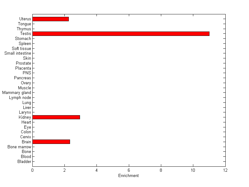 The expression level is normalized with tissue-library size. Each value for a gene in a tissue is a ratio of observed ESTs to the expected one in this tissue. The expected number of ESTs is the product of total ESTs of the gene and the fraction of total ESTs in the tissue among all ESTs in 30 tissues.