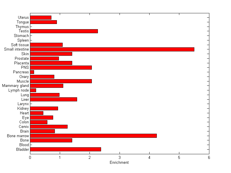 The expression level is normalized with tissue-library size. Each value for a gene in a tissue is a ratio of observed ESTs to the expected one in this tissue. The expected number of ESTs is the product of total ESTs of the gene and the fraction of total ESTs in the tissue among all ESTs in 30 tissues.