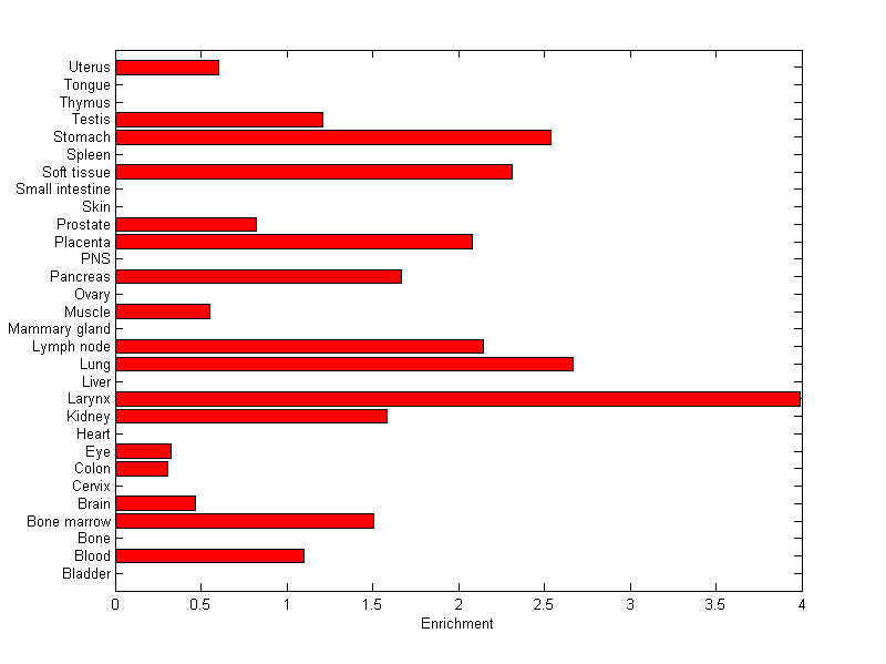 The expression level is normalized with tissue-library size. Each value for a gene in a tissue is a ratio of observed ESTs to the expected one in this tissue. The expected number of ESTs is the product of total ESTs of the gene and the fraction of total ESTs in the tissue among all ESTs in 30 tissues.
