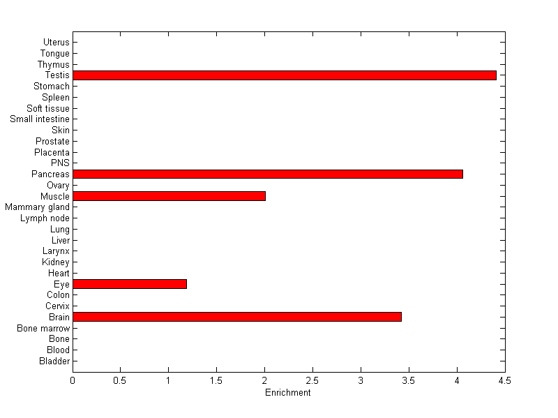 The expression level is normalized with tissue-library size. Each value for a gene in a tissue is a ratio of observed ESTs to the expected one in this tissue. The expected number of ESTs is the product of total ESTs of the gene and the fraction of total ESTs in the tissue among all ESTs in 30 tissues.