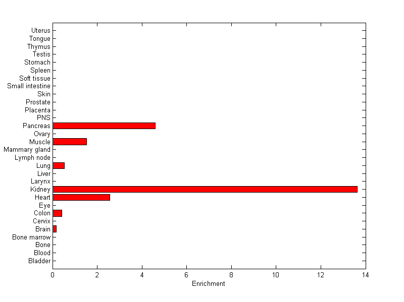 The expression level is normalized with tissue-library size. Each value for a gene in a tissue is a ratio of observed ESTs to the expected one in this tissue. The expected number of ESTs is the product of total ESTs of the gene and the fraction of total ESTs in the tissue among all ESTs in 30 tissues.