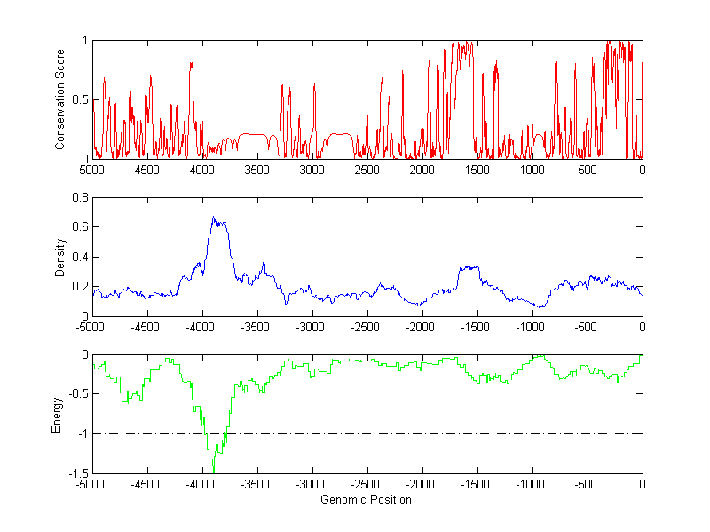 The energy profile (green curve) is about energy for module detection based on TF interaction. The positions with energy less than -1 indicate the existence of CRMs.