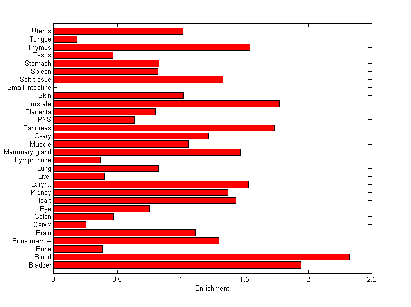 The expression level is normalized with tissue-library size. Each value for a gene in a tissue is a ratio of observed ESTs to the expected one in this tissue. The expected number of ESTs is the product of total ESTs of the gene and the fraction of total ESTs in the tissue among all ESTs in 30 tissues.