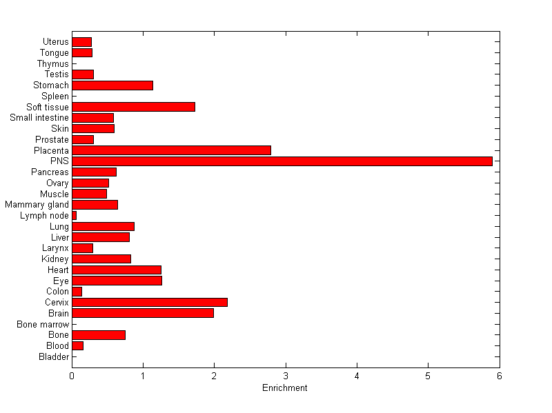 The expression level is normalized with tissue-library size. Each value for a gene in a tissue is a ratio of observed ESTs to the expected one in this tissue. The expected number of ESTs is the product of total ESTs of the gene and the fraction of total ESTs in the tissue among all ESTs in 30 tissues.