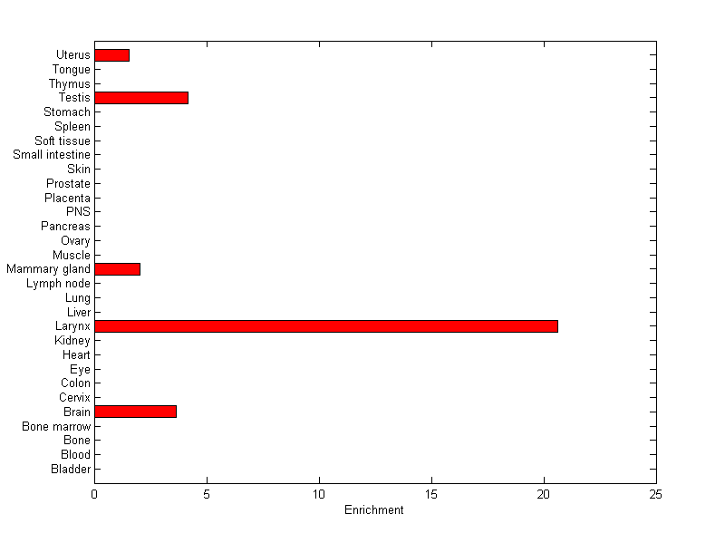 The expression level is normalized with tissue-library size. Each value for a gene in a tissue is a ratio of observed ESTs to the expected one in this tissue. The expected number of ESTs is the product of total ESTs of the gene and the fraction of total ESTs in the tissue among all ESTs in 30 tissues.