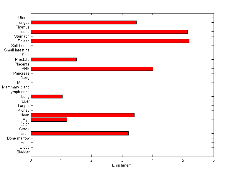 The expression level is normalized with tissue-library size. Each value for a gene in a tissue is a ratio of observed ESTs to the expected one in this tissue. The expected number of ESTs is the product of total ESTs of the gene and the fraction of total ESTs in the tissue among all ESTs in 30 tissues.