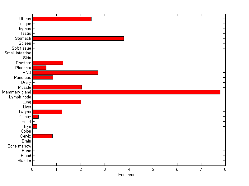 The expression level is normalized with tissue-library size. Each value for a gene in a tissue is a ratio of observed ESTs to the expected one in this tissue. The expected number of ESTs is the product of total ESTs of the gene and the fraction of total ESTs in the tissue among all ESTs in 30 tissues.