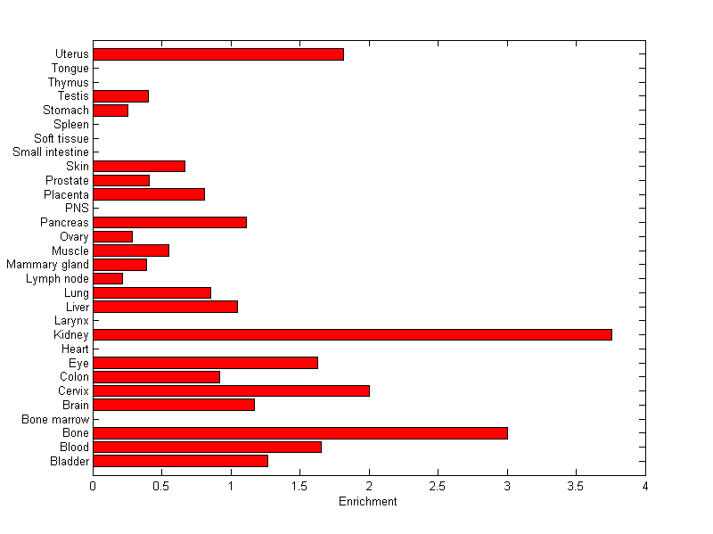 The expression level is normalized with tissue-library size. Each value for a gene in a tissue is a ratio of observed ESTs to the expected one in this tissue. The expected number of ESTs is the product of total ESTs of the gene and the fraction of total ESTs in the tissue among all ESTs in 30 tissues.