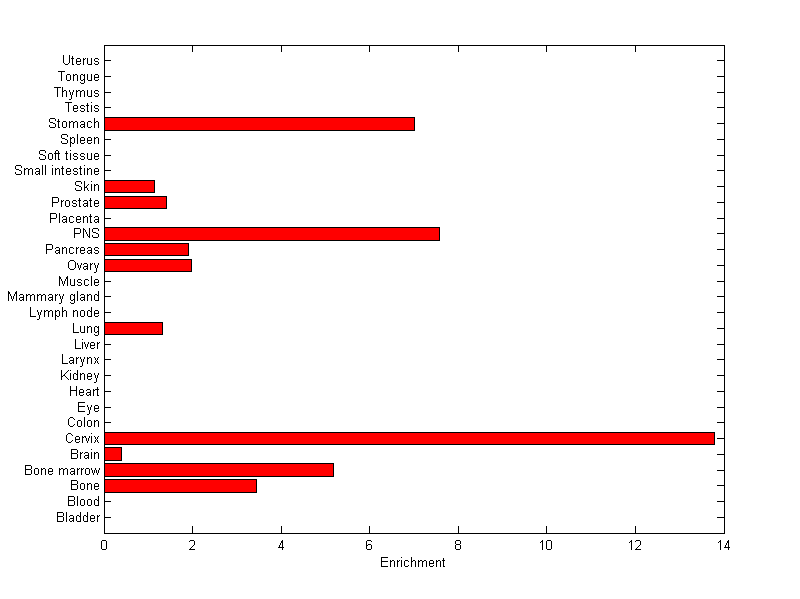 The expression level is normalized with tissue-library size. Each value for a gene in a tissue is a ratio of observed ESTs to the expected one in this tissue. The expected number of ESTs is the product of total ESTs of the gene and the fraction of total ESTs in the tissue among all ESTs in 30 tissues.