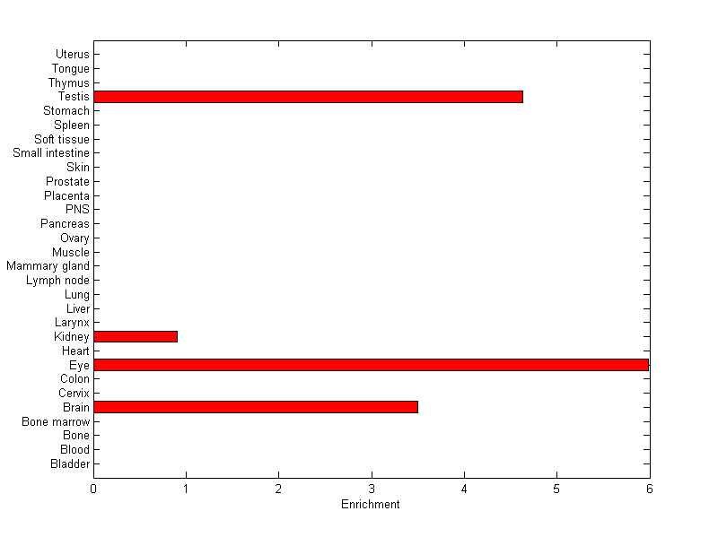 The expression level is normalized with tissue-library size. Each value for a gene in a tissue is a ratio of observed ESTs to the expected one in this tissue. The expected number of ESTs is the product of total ESTs of the gene and the fraction of total ESTs in the tissue among all ESTs in 30 tissues.