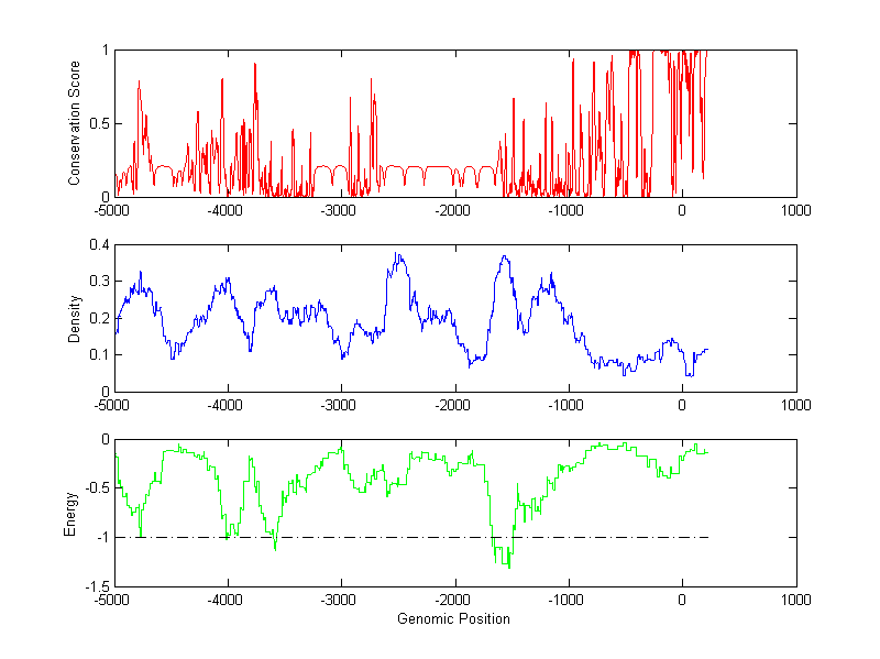 About the profiles: The conservation profile (red curve) is about conservation scores of the promoter sequences. Conservation was determined from an eight-way alignment of human, chimpanzee, dog, mouse, rat, chicken, zebrafish and fugu sequences. The conservation was quantified by a conservation score between 0 and 1, with 1 as highest conservation. The conservation score was obtained from UCSC genome databases. The density profile (blue curve) is about density of all TF binding sites. The energy profile (green curve) is about energy for module detection based on TF interaction. The positions with energy less than -1 indicate the existence of CRMs. Download: Conservation profileDensity profile Energy profile CRM summary |
