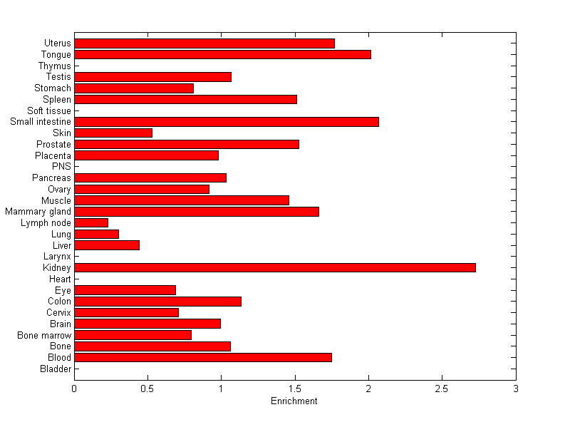 About the profile: The expression level is normalized with tissue-library size. Each value for a gene in a tissue is a ratio of observed ESTs to the expected one in this tissue. The expected number of ESTs is the product of total ESTs of the gene and the fraction of total ESTs in the tissue among all ESTs in 30 tissues. Download: |