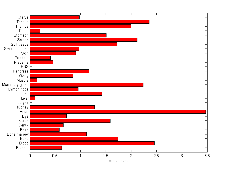 The expression level is normalized with tissue-library size. Each value for a gene in a tissue is a ratio of observed ESTs to the expected one in this tissue. The expected number of ESTs is the product of total ESTs of the gene and the fraction of total ESTs in the tissue among all ESTs in 30 tissues.
